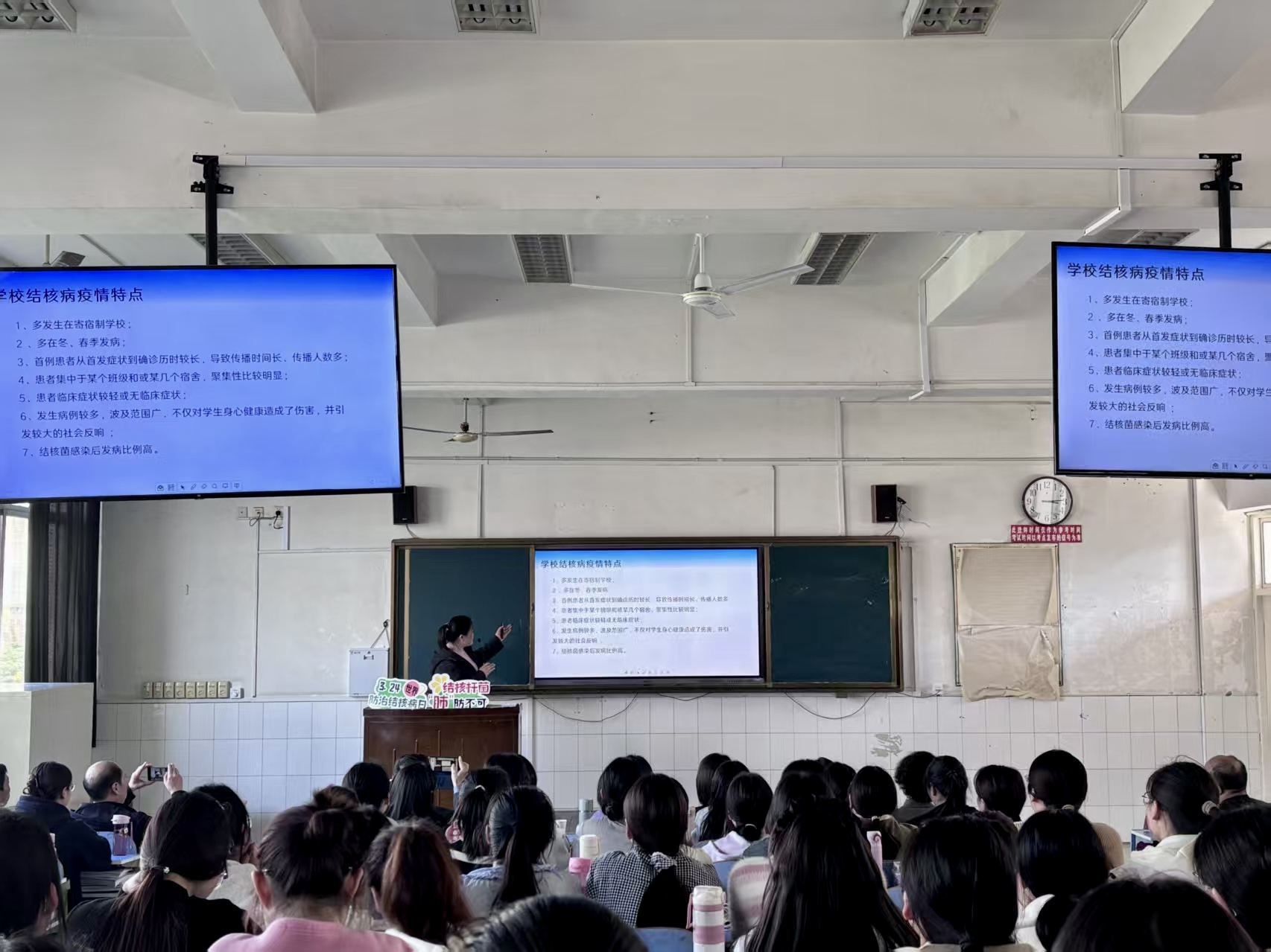 2025年的3月24日是全球第30个世界防结核日。为提高同学们对结核病防治工作的认识,防治结核病的发生,南阳医专心理健康关爱与教育中心在3月24日下午特邀卧龙区疾病预防控制中心领导为我学子开展讲座及现场活动。出席本次活动的有卧龙区疾病预防控制中心书记、主任周丽娜、卧龙区卫健委疾控科科长王云霞、卧龙区疾病预防控制中心副主任马伟科、卧龙区疾病预防控制中心结核病防治科科长刘超、卧龙区疾病预防控制中心学校卫生科科长程义学