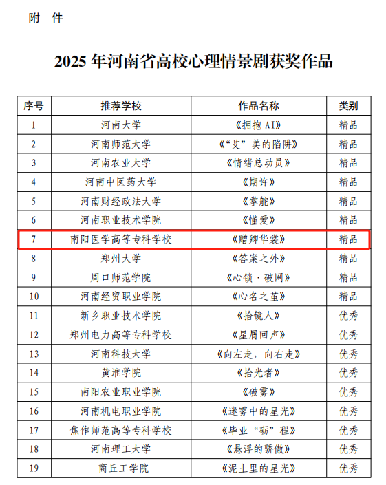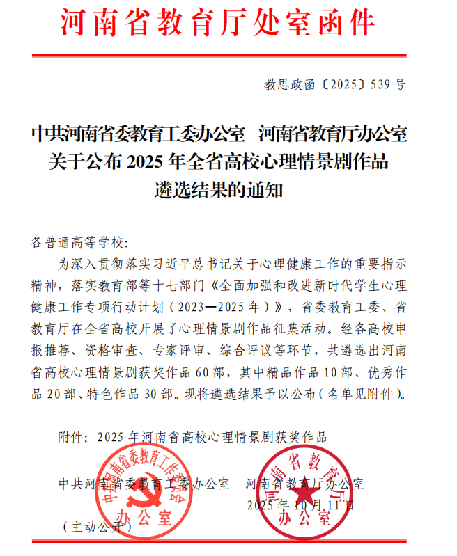 近日,河南省教育厅正式公布了全省高校心理情景剧作品遴选结果,经各高校申报、资格审查、专家评审、综合评议等环节,共遴选出河南省高校心理情景剧获奖作品60部,其中精品作品10部、优秀作品20部、特色作品30部。我校报送的心理情景剧作品《赠卿华裳》荣获河南省高校心理情景剧精品作品,并将于10月20日晚参加省教育厅在河南中医药大学组织的精品剧目现场展演。